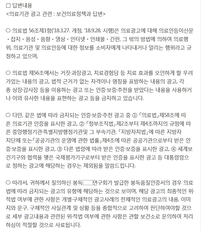 의료기관의 광고와 관련하여 보건의료정책과는 "귀하께서 질의하신 봉독OO연구회가 발급한 봉독품질인증서의 경우 의료법에 따라 금지되는 광고의 유형에 해당하는 것으로 보이며"라고 답변하였다. 불법 의약품 제조 의혹에 대하여 한의약정책과는 의약품의 제조와 조제와 차이에 대해서만 잔뜩 설명을 늘어놓다가, "○ 참고로 봉독OO연구회는 대한한의학회 산하 학회가 아닌 것으로 확인되었습니다. 특정 의료기관에서의 불법 제조가 의심되는 경우에는 구체적 사실관계에 대한 확인이 필요한 바, 해당 의료기관 관할 보건소와 상의하여 주시기 바랍니다."라는 하나 마나 한 내용으로 답변하였다.