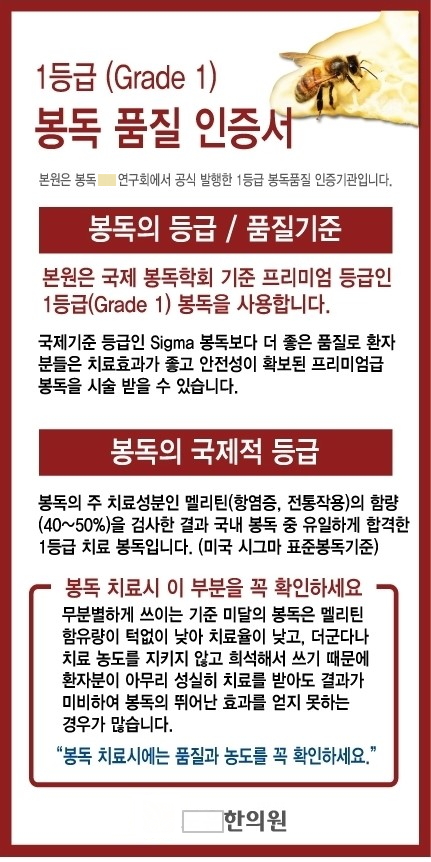 봉독품질인증서에는 "본원은 봉독OO연구회에서 공식 발행한 1등급 봉독품질 인증기관입니다. 본원은 국제봉독학회 기준 프리미엄 등급인 1등급(Grade 1) 봉독을 사용합니다. 국제기준 등급인 Sigma 봉독보다 더 좋은 품질로 환자분들은 치료효과가 좋고 안전성이 확보된 프리미엄급 봉독을 시술 받을 수 있습니다", "봉독의 주 치료성분인 멜리틴(항염증, 진통작용)의 함량(40~50%)을 검사한 결과 국내 봉독 중 유일하게 합격한 1등급 치료 봉독입니다 (미국 시그마 표준봉독기준)" 등의 내용이 기재되어 있었다. 그러나 국제봉독학회라는 단체도, 미국 시그마 표준봉독기준도 찾을 수 없었다. 이 인증서를 본 환자들은 이 인증서를 받은 한방의료기관이 가장 고품질의 봉독을 사용하므로 치료효과도 좋고 아주 안전한 봉침술을 받을 것으로 인식할 것이고, 따라서 한의사의 봉침시술 권유에 넘어가지 않을 수가 없을 것이다.