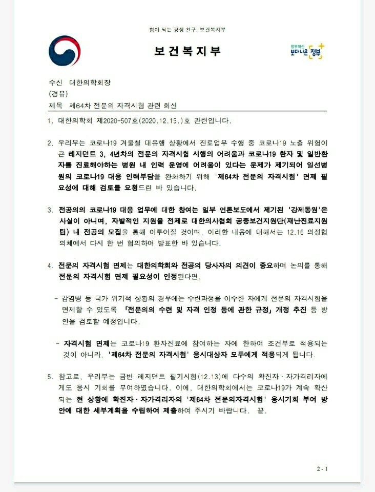 20.12.21 '코로나19 전공의 인력 차출·전문의 시험 면제 포기 못한 복지부, 의학회에 ...