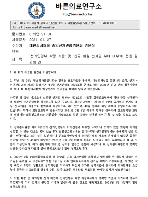 21.02.01 바른의료연구소, 신입 의사회원 선거권 관련 공식 질의해 답변 이끌어내